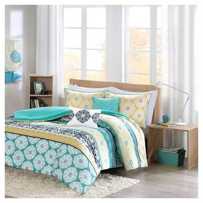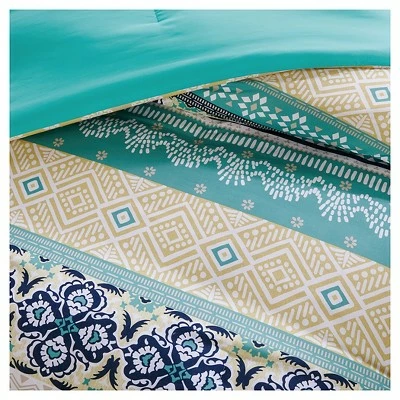 The Aneesa Comforter Set offers a bright and colorful update to your bedroom. This microfiber comforter features medallion and geometric prints in bold stripes and colors to invigorate your space with a chic boho look. A solid reverse adds a vibrant splash of color to the comforter set. The 2 matching shams (1 in Twin/TwinXL) complement the top of the bed, while 2 decorative pillows provide the charming finishing touches to the comforter set. This boho comforter set also has an antimicrobial treatment that provides built-in freshness protection, reducing the growth of odor causing bacteria to keep fabric lasting longer.