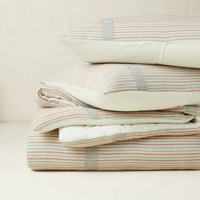 The Yarn-Dyed Gauze Stripe Comforter & Sham Set from Opalhouse™ designed with Jungalow™ is perfect to provide a cozy night’s sleep. This comforter bedding set includes a soft-filled comforter decorated with multicolor vertical and horizontal stripes of yarn-dyed gauze over a cream background. The solid finish in coordinating cream on the opposite side gives the comforter a chic look. This set includes one comforter and one matching pillow sham for the Twin/Twin Extra Long size, or two matching pillow shams for the Full/Queen & King sizes. Made from 100% cotton, this comforter and pillow sham set brings you year-round comfort, while the machine-washable design makes for easy care and cleaning — simply add sheets and decorative pillows of your choice to bring a refreshing update to any bedroom’s decor.