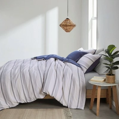 The Ansley 5 Piece Striped Organic Cotton Yarn Dyed Comforter Cover Set with removable insert offers a simple and clean update to your bedroom. This organic cotton comforter cover features a woven stripe pattern with a solid reverse, for a modern casual look. A removable insert is included, and secured by corner ties and a button closure to make washing easier. The 2 matching shams also showcase yarn dyed stripes to complement the oversized comforter cover, and a decorative pillow completes the contemporary comforter set. An antimicrobial treatment provides built-in freshness protection, reducing the growth of odor causing bacteria to keep fabric lasting longer. This striped bedding set is also OEKO-TEX certified, meaning it does not contain any harmful substances or chemicals to ensure quality comfort.