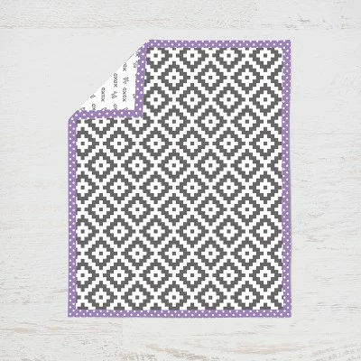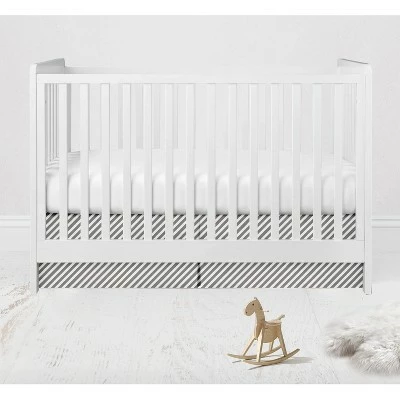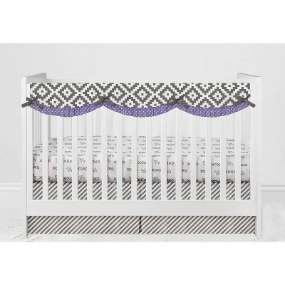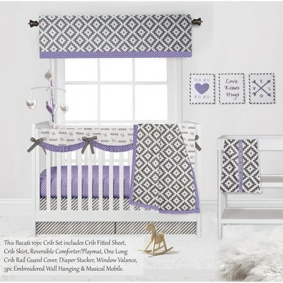 - This Bacati 10-piece Crib Set Includes Reversible Comforter/Playmat (33 x 43 inches), Crib fitted sheet (52 x 28 x 6 inches), Crib Skirt/Dust ruffle (13 inch drop) Diaper Stacker (holds more than 30 newborn diapers), Reversible Long Crib Rail Guard Cover (52 x 12 inches), Window Valance (15 h x 56 w inches with 1.75 inch Rod Pocket), 3 pc Wall Hangings Set and Musical Mobile in fun, colorful and signature prints in 100 percent cotton 200 Thread Count percale fabrics. Designed in United States by Experienced Designers. Many coordinating items available to purchase separately in this Bacati Love Aztec Gray Lilac Bedding Collection.