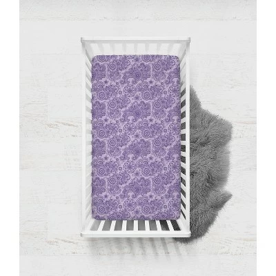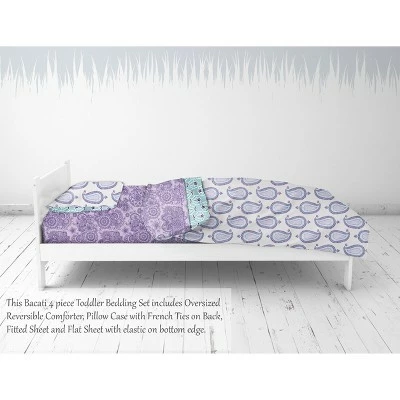 - This Bacati 4-piece Toddler Bedding Set Set Includes Reversible Oversize Comforter (42 x 55 inches), Toddler Bed Fitted Sheet(52 x 28 x 6 inches), Toddler Bed Flat Sheet(52 x 42 inches) which is fitted at the bottom to make the bed easily and Standard Pillow Case (20 x 25 inches) with french ties on the back in fun, colorful and signature prints in 100 percent cotton 200 Thread Count percale fabrics. Designed in United States by Experienced Designers. Many coordinating items available to purchase separately in this Bacati Paisley Isabella Purple Lilac Aqua Bedding Collection.