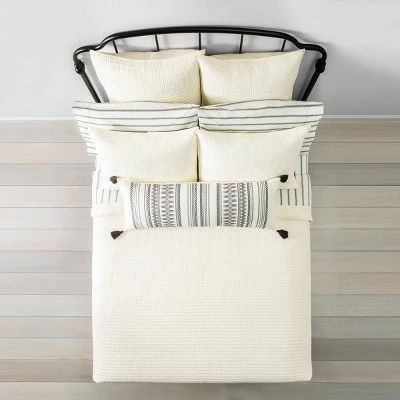 Enhance your bedroom in sleek sophistication with the Standard Cream Quilt and Sham Set from Hearth & Hand™ with Magnolia. Crafted from 100% cotton for long-lasting comfort, this striped bedding collection features quilted pillow shams, a textured stripe quilt and an organic sheet set to offer the right amount of comfort and style for your bed.