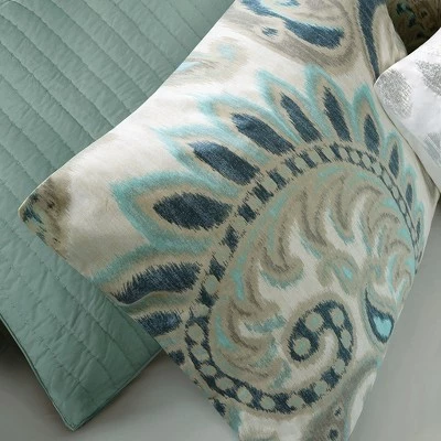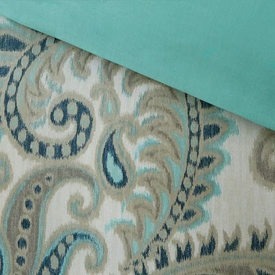 Refresh your bedroom space with the updated style of the Mira 3 Piece 100% Cotton Comforter Set. This cotton comforter showcases a large paisley print in modern colors with a solid reverse that adds a soft splash of color. Hidden bartacking in the comforter secures the filling and creates a clean duvet-like finish. The 2 matching shams repeat the paisley design of the comforter to complete the chic boho-inspired look. This comforter set is OEKO-TEX certified, meaning it does not contain any harmful substances or chemicals, and uses an antimicrobial treatment that provides built-in freshness protection, reducing the growth of odor causing bacteria to keep fabric lasting longer. Euro shams and decorative pillows are sold separately.