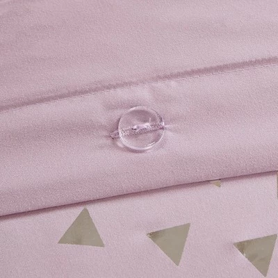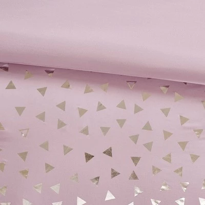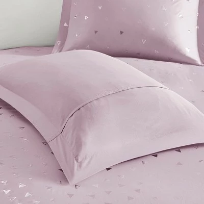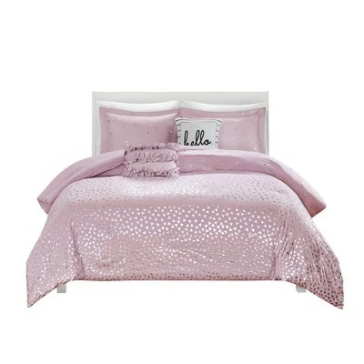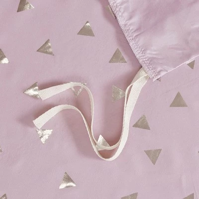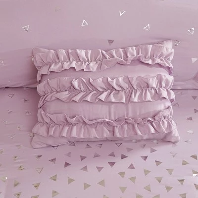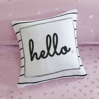 Add some stylish shimmer to your bedroom with this Nova Metallic Duvet Cover Set. Featuring an allover metallic triangle pattern, this duvet cover bedding set brings striking appeal to the top of your bed. With one matching sham and a duvet cover, this stylish set gives a coordinated look to your bed. The two decorative pillows β one square pillow with contrasting “Hello” embroidery and one with pretty frills β give it a dressy appeal. The super-soft microfiber construction lends comfort and lasting style, and can be easily machine washed for easy care.