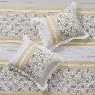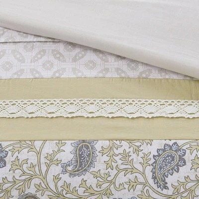 The Stella Cotton Percale Comforter Set offers a shabby chic update to your bedroom decor. A paisley print is featured on the cotton comforter with pintucked fabric separated by lace taping embellishments. Around the edge, a ruched flange adds a graceful touch, for a charming cottage look. Matching shams mirror the design of the comforter, while 2 solid Euro shams complement the top of the bed. The 3 decorative pillows and a solid bedskirt complete this farmhouse comforter set. This bedding set is also OEKO-TEX certified, meaning it does not contain any harmful substances or chemicals to ensure quality comfort and wellness. A coordinating shower curtain is available and sold separately.