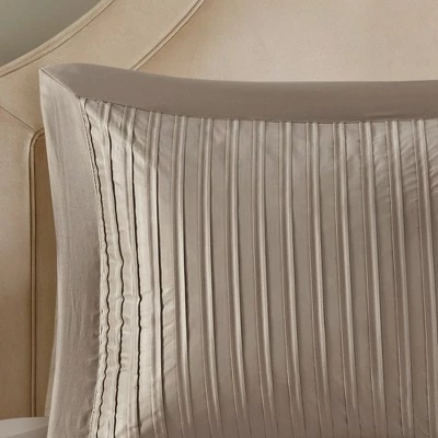 The Vargas Collection provides a modern look through fabric manipulation. This beautiful taupe polyester charmeuse gives a slight sheen to this bed, while the small pleating on the bottom half of the bed and corresponding shams provide great dimension for your room. Three decorative pillows use embroidery and pleating to bring this beautiful collection together.