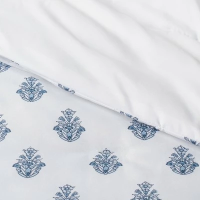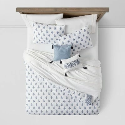 Bring a refreshing and soothing look to your bedroom with the Norwood Block-Print with Border Comforter Bedding Set from Threshold™. The white comforter is adorned with an allover floral block print in blue shades, and is framed by a coordinating border for an appealing touch to liven up your room instantly. The set includes a square and a rectangular decorative pillow with stripes or a border design, as well as a matching pillow sham, that coordinate with the top of the bed for a cohesive look. This comforter bedding set features a year-round fabric construction for comfortable use. Pair it with white bedsheets to enhance the fresh and clean look, and toss in throw pillows in coordinating colors and patterns to finish a lovely setting.