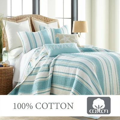 - COORDINATE YOUR ROOM DECOR: Create a wonderful bedroom space with our coordinated reversible matching bed set. The shades of aqua blue, taupe and white design brings traditional coastal accents into your home and will match a variety of different looks and bedroom decor. You can also freshen your room with matching coordinating decorative pillows from the Levtex Home collection.