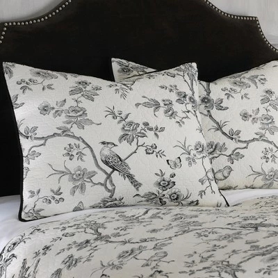 The Black Toile Reversible Quilt Set by Levtex Home is inspired by traditional french wall coverings. Offered in shades of black and cream, this design will immediately transform your bedroom. Made with the softest lightweight cotton, this reversible quilt features a delicate, detailed vine and bird toile. Enjoy this for years to come!