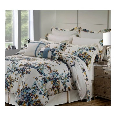 This soft and supple printed 300 thread count long staple cotton sateen 12-piece bedding set includes one oversized comforter, two shams, two Euro shams, two decorative pillows, one bed skirt, one oversize flat sheet, one deep pocket fitted sheet, and two pillowcases. Available in Queen, King, Cal King and Full sizes.