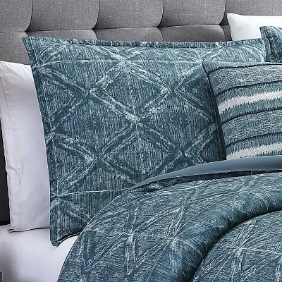 Daytona, from Riverbrook Home features a bold, global geometric print in a soft indigo blue. This 7 piece collection makes a big statement with an assortment of shams and decorative pillows creating the complete relaxed look to instantly update your space. Set include comforter, 2 shams, 1 bedskirt and 3 decorative pillows. Machine washable for easy care.