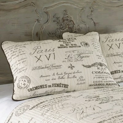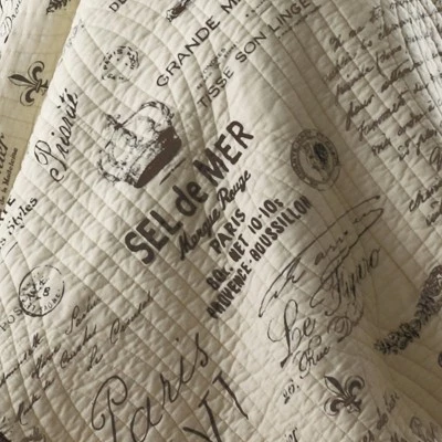 Dream of romantic locales with the Homethreads Script Quilt Set. This sweet bedspread set pays homage to a well-traveled passport and nods to hand-written travel correspondence and classic French type design. Featuring nostalgic quilt stitching underneath a type-driven print, a reversible option, a 100% cotton construction and decorative scalloped detailing with contrasting trim. A pretty comforter for both contemporary and traditional bedrooms.