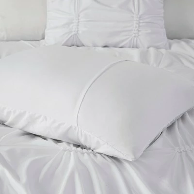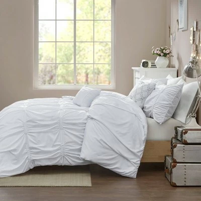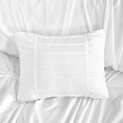 Style your space with the casual elegance of Rory Tufted Comforter Bedding Set with Decorative Pillows. This beautiful comforter and sham features elastic embroidery with pleated panels, adding dimension and charm to the bedding set. A square decorative pillow with metallic embroidery makes statement on top of the bed, while an oblong pillow with fabric manipulation provides a charming touch. Machine washable for easy care, this comforter set brings a chic look to your bedroom decor.