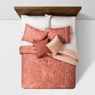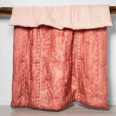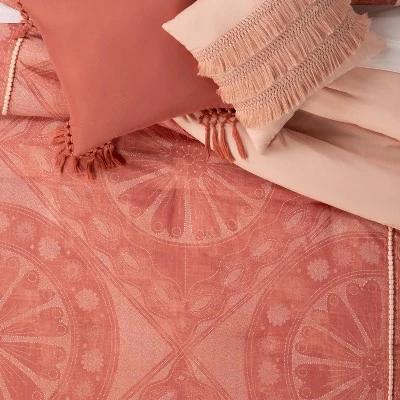 Add a beautiful, romantic look to any room with the Jessamine Pom Trimmed Comforter Set from Opalhouse™. This lightweight bedding set includes a soft-filled comforter featuring geometric-medallion motifs with calming floral accents and a rose background for smooth relaxation, while the white pompom trim along the sides adds a lovely textured finish. The pillow sham coordinates with the comforter, while the two decorative pillows come in solid rose and blush hues accented with either crochet or tassel-fringe detail to create a stunning look.