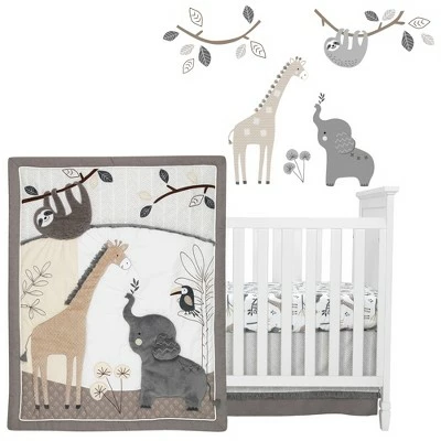 This four-piece nursery baby bedding set includes one quilt, one 100% cotton fitted crib sheet, one crib skirt and a complete set of wall decals. The neutral color palette of gray, taupe, tan, cream and charcoal gray makes it perfect for baby boys and girls. The quilt features a 28” tall giraffe made with a textured chevron patterned minky. His mane is a thick eyelash trim in gray and his tassel tail is made of gray yarn. His feet are a charcoal gray corduroy. Our sweet baby elephant is made with gray minky, he has a 3-dimensional ear with embroidered stitching and a yarn tassel tail. A friendly toucan is appliqued in gray corduroy with cream fur minky and stands comfortably on an outlined tree branch. Up at the top of the quilt is a fuzzy, smiling, gray sloth hanging from a brown tree branch. His name is Speedy, and he is sure to delight your little adventurer. The 100% breathable cotton fitted crib sheet features giraffes, elephants, toucans, sloths and small trees and branches on a crisp white ground. The 100% cotton fitted crib sheet has elastic all around ensuring a safe and secure fit. The crib skirt gives the finishing touch to your child’s crib. It is a gray and white chevron print on the top and a textured gray fabric on the bottom with gray tassel trim in between the two fabrics. Complete this incredible jungle nursery with these custom jumbo wall decals featuring our tall giraffe, elephant, sloth, branches and leaves. They add a designer touch to a feature wall in the baby’s room.
