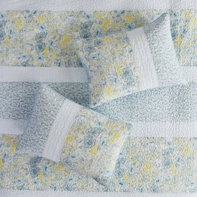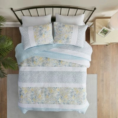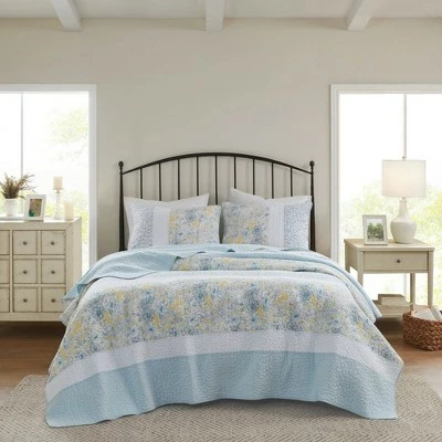 Style your bedroom with the soft and cozy cottage charm of the Madison Park Juniper 3 Piece Reversible Cotton Coverlet Set. This cotton coverlet features a striped motif of solids and floral prints that are pieced together, for a charming farmhouse look. A solid aqua reverse complements the top of the coverlet, while the 2 coordinating shams complete the cotton bedding set. Machine washable for easy care, this farmhouse coverlet set has an antimicrobial treatment that provides built-in freshness protection, inhibits growth of odor causing bacteria, and keeps the fabric newer, longer.