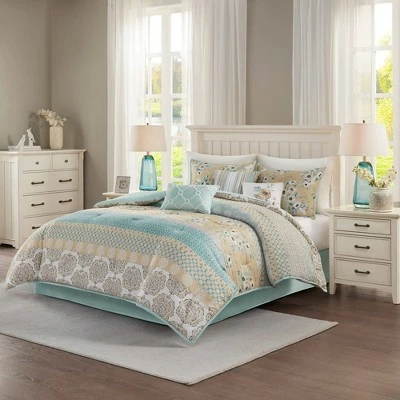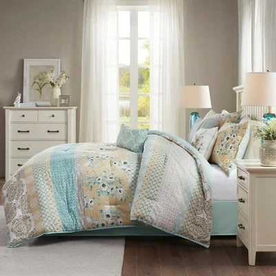 Give your bedroom a cozy country vibe with the Loraine 7 Piece Cotton Printed Comforter Set. The cotton sateen comforter features printed floral and geometric designs to create an updated cottage look. Two matching shams pair perfectly with the comforter and three decorative pillows add a textural elements to the bedding set. A solid bedskirt rounds out this comforter set, giving it a clean finish. Machine washable for easy care, this cotton printed comforter set brings a country charm to your bedroom.