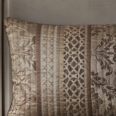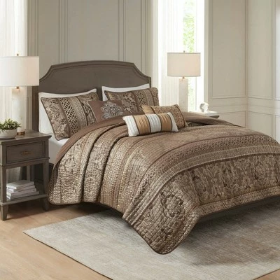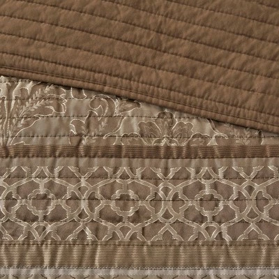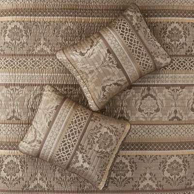 To add a touch of richness to your current decor, the Mirage 6pc Polyester Jacquard Reversible Quilted Coverlet Bedding Set offers a luxurious update to your room. Made from polyester jacquard, the coverlet and shams share leaf, striping and ironwork motifs. This collection will adding a lavish feeling to your decor. Three decorative pillows feature pleating and embroidery details that correspond back to the coverlet, bringing the entire look together. Machine washable for easy care, spot clean on decorative pillows, this jacquard coverlet set brings an extravagant and traditional touch to your bedroom.