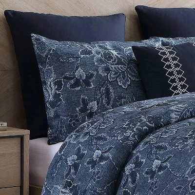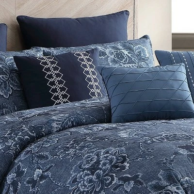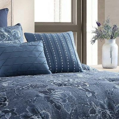 The Monique comforter set by Riverbrook Home is a stylish floral print on a textured faux linen fabric. The casual yet tranistional stying allows you to coordinate your accessories in a great variety of ways! Rich blues accent the print to create a unique statement. Set includes 1 comforter, 2 shams, 2 euro shams (3 in king size) and 3 decorative pillows. Machine washable for easy care.