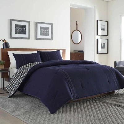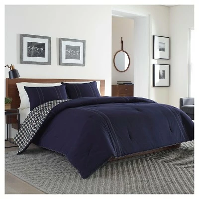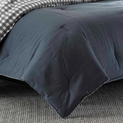 Inspired by the classic design and construction of Eddie Bauer menswear, the Kingston ensemble features an Indigo cotton twill face with contrast double needle topstitching at the bed breaks and on the coordinate shams as well as a decorative edge finish for both. The comforter reverses to a handsome Indigo and Ivory buffalo plaid printed on cozy, soft all cotton flannel for additional warmth and comfort. Matching cotton flannel plaid European shams are also available to complete the look.