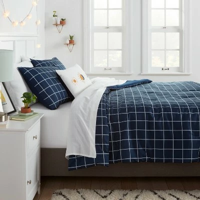 Provide your bedroom an instant chic makeover with the Reversible Microfiber Grid Comforter Collection from Room Essentials™. This decorative bedding collection includes a comforter and a coordinating sham, each boasting a microfiber construction that feels soft against your skin as you drift off to dreamland. Featuring a classic grid pattern with crisp, contrasting colors and a matching solid reverse side, this comforter collection lends classic style to your bedding. Simply coordinate the pieces with the sheets of your choice to highlight the contemporary style of your sleeping space.