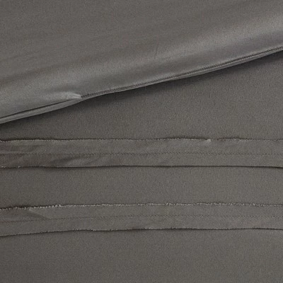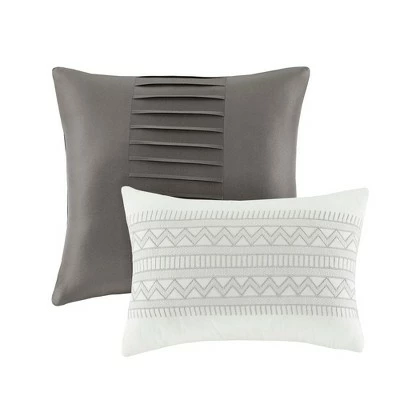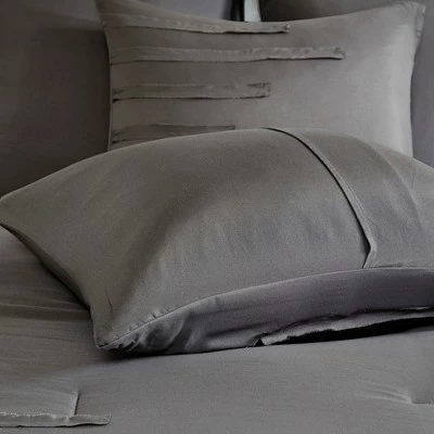Bring a casual farmhouse look to your bedroom décor with the 8pc Jaine Comforter Set. The dark gray comforter and shams feature raw edge ribbon detailing that add dimension and texture to the top of the bed. Matching solid gray Euro shams complement the casual bedding set, while decorative pillows with embroidery and pleated details provide elegant accents. A solid gray bed skirt completes the bedding set to give it a clean finish. Made from ultra-soft microfiber with hypoallergenic filling, this farmhouse comforter set is machine washable for easy care.