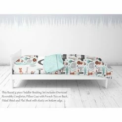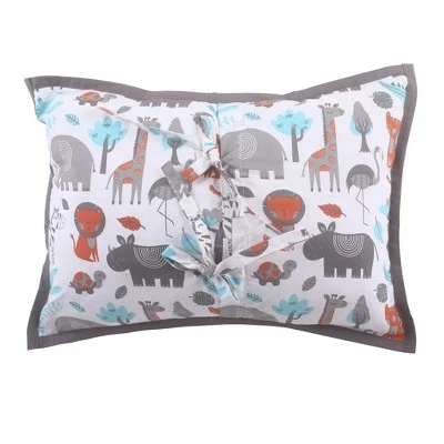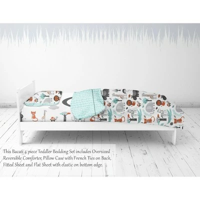 - This Bacati 5-piece Toddler Bedding Set Set Includes Reversible Oversize Comforter (42 x 55 inches), Small Pillow (14 x 20 inches) with Filler, Toddler Bed Fitted Sheet(52 x 28 x 6 inches), Toddler Bed Flat Sheet(52 x 42 inches) which is fitted at the bottom to make the bed easily, a Standard Pillow Case (20 x 25 inches) with French ties on the back as well as a Embroidered Decorative Pillow with Filler in fun, colorful and signature prints in 100 percent cotton 200 Thread Count percale fabrics. Designed in United States by Experienced Designers. Many coordinating items available to purchase separately in this Bacati Safari Animals Aqua Orange Gray Bedding Collection.