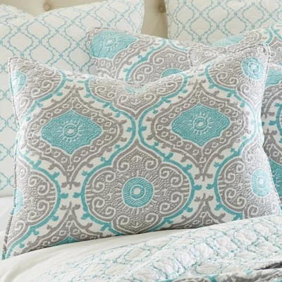 The Gramercy Reversible Quilt Set by Levtex Home is inspired by classic woven medallions. Offered in shades of grey, teal and ivory, this design will immediately transform your bedroom. Made with the softest lightweight cotton, this reversible quilt features a beautiful pattern of interlocking medallions on the one side, reversing to a teal on white trellis on the other. The Quilt Set has a cotton rich filler and is machine washable. Enjoy this for years to come!