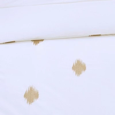 Give your bedroom an eclectic update with the 3pc Stella Dot Cotton Comforter Mini Set. The comforter and coordinating shams showcase an all over copper metallic embroidery with an ikat flair. These ornate dots are highlighted beautifully against a crisp white ground and allow you to easily mix and match different colors and textures with the top of bed. Made of 200 TC cotton percale, this comforter is exceptionally soft to the touch and is machine washable for easy care. The Collection offers a unique finishing technique that offers a clean, duvet-like finish with no bar tacks on the top of the comforter.