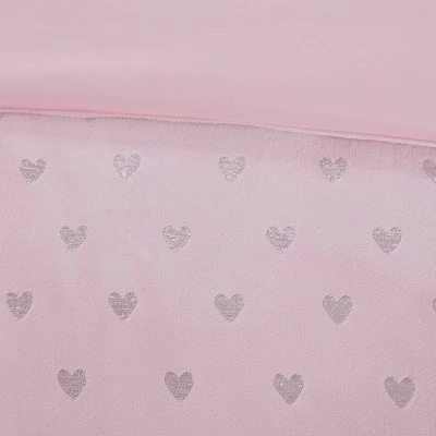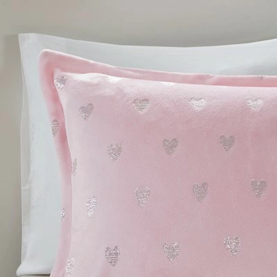 The Mi Zone Audrey Metallic Printed Plush Comforter Set brings a bright and casual update to your bedroom. A metallic heart print adorns the plush comforter and shams (1 in Twin/TwinXL) creating a soft and fun look. An oblong decorative pillow with a pompom trim and hearts adds a lovely touch to the bedding set. This bedding set is also OEKO-TEX certified, meaning it does not contain any harmful substances or chemicals to ensure quality comfort. Items in the set may come in a rolled or compressed packaging, which will need to be fluffed up or steam ironed before use to remove wrinkles.