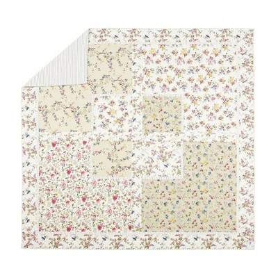 Add the enchanting ambiance of spring to your bedroom with the Phillipa Quilt from Jessica Simpson. Vintage inspired floral prints of rosy pink, blue, and sunny yellow grace a white ground. Among the flowers, bluebirds perch and butterflies flutter. The reverse is a denim blue ticking stripe that is also pieced into the face.