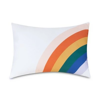When color comes out to play you will see a rainbow. Bring a bright focal point to your room with the Rainbow comforter from Ampersand. This bold graphic icon of color will wake up your room in style! The rainbow arches across one corner of the comforter in blush, red, yellow, green, blue, and lilac. This cozy comforter is all cotton with polyester fill.