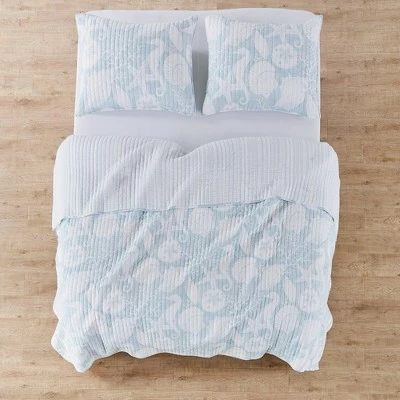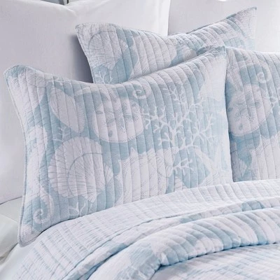 The Stillwater Reversible Quilt Set by Levtex Home is inspired by a long walk on a sun-drenched shore. This intricate shell and coral design will immediately transform your bedroom. Made with the softest lightweight cotton, this reversible quilt features a shells in coral in of white relief on a pale blue ground, reversing to a blue and white stripe on the other. Enjoy this for years to come!