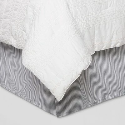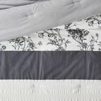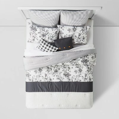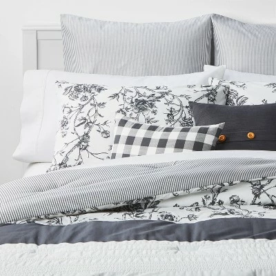 Give any bedroom a charming update with the Brookton Reversible Farmhouse Floral Comforter Set from Threshold™. Featuring a reversible design, this printed bedding set comes with a comforter, matching pillow shams, Euro shams, decorative pillows and a bed skirt to create a complete and cohesive look. The soft comforter features pieced panels of white seersucker fabric with solid gray at the bottom accompanied by a floral print at the top, which reverses to a classic pinstripe design in charcoal and white. The pillow shams are decked out in coordinating prints, while the decorative pillows showcase a plaid pattern and solid gray with button detail to complete the stunning look.