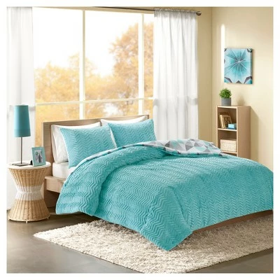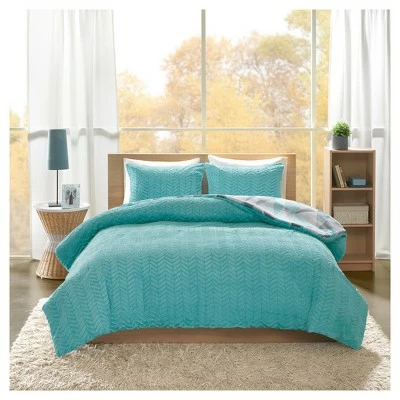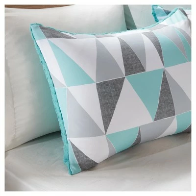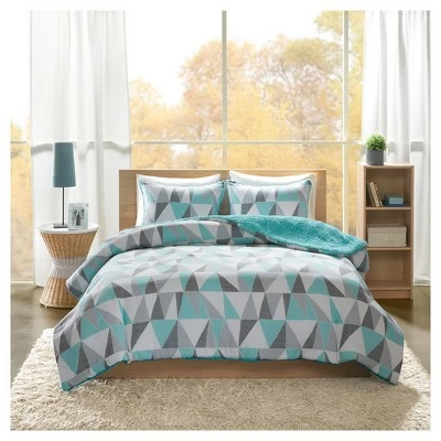 Add shape to your bedroom with the Haley Reversible Comforter Mini Set. Featuring a palette of aqua, white, light and dark gray, the comforter showcases a triangular geometric pattern that sharpens its style. Flip the comforter over, to the reverse, for some extra fun and charm with the aqua chevron faux fur. Also included is a coordinating sham that completes this comforter set.