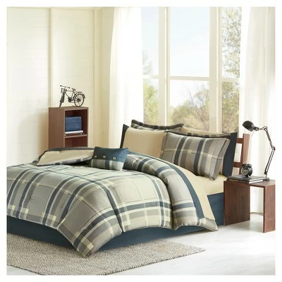 The Rick Comforter and Sheet Set will bring a comfortable look and feel to your room. The comforter and matching shams (1 in Twin/TwinXL) sport a plaid print in a modern color palette for a casual update. A complete sheet set features a contrasting flange that adds a bold accent to the sheet set, while a decorative pillow and navy bed skirt provides the finishing touches. With its handsome combination of bold and soft colors, this comforter and sheet set adds a classically stylish look to your bedroom. This bedding set is also OEKO-TEX certified, meaning it does not contain any harmful substances or chemicals to ensure quality comfort and wellness.