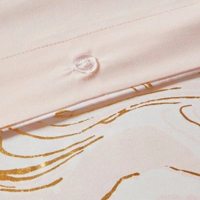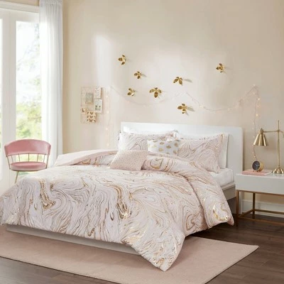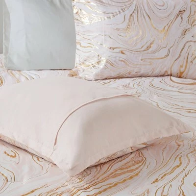 Make your bedroom shine with the Intelligent Design Vanessa Metallic Printed Duvet Cover Set. The extra-soft, brushed duvet cover flaunts a swirl marble print, for a stunning contemporary design. A solid color reverse complements the top of the bed, while matching shams (1 for Twin Sizes) mirror the look of the duvet cover. Two decorative pillows with hypoallergenic polyester filling and shiny metallic thread add the perfect finishing touches. This bedding set is OEKO-TEX certified, meaning it does not contain any harmful substances or chemicals, and uses an antimicrobial treatment that provides built-in freshness protection, reducing the growth of odor causing bacteria to keep fabric lasting longer. A button closure allows you to place a padded insert within the duvet cover and internal corner ties prevent it from shifting (Insert is NOT included).