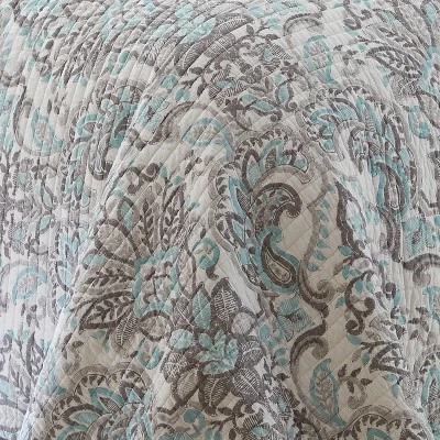 - LEVTEX LEGACY QUILT BED SET: A intricate grey and teal paisley bedding set consisting of a quilt and matching pillow shams. Used by itself, as a layering piece or as a bedspread, this bedding set is extremely versatile.