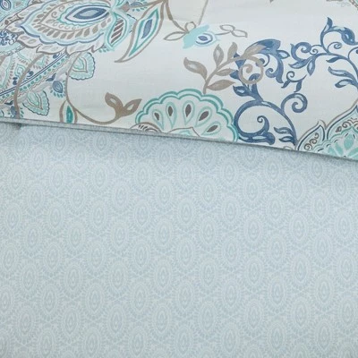 Refresh your bedroom with the Lian 8 Piece Cotton Printed Reversible Comforter Set. The 100% cotton percale comforter and shams flaunt a botanical floral design with a medallion motif printed in soft watercolor hues. Overfilled for exceptional warmth and softness, the comforter is reversible displaying a printed pattern to complement the top of the bed. Two solid Euro shams and a solid bed skirt add a rich touch of color to the bedding set. Elegantly embroidered decorative pillows provide charm and dimension, completing the shabby chic look of this cotton printed reversible comforter set.