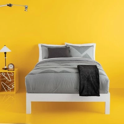 Switch up the look of your master suite or guest bedroom with this Triangle Lines Bed-in-a-Bag from Room Essentials™. This microfiber bedding set features a pattern of black triangles in a geometric line design for a modern look, and the decorative pillow showcases in a waffle weave for a textured finish. Plus, the sham comes with a European-style closure to keep the insert neatly tucked in and for easy cover removal. Crafted from ultra-soft brushed microfiber for ultimate comfort, this printed bedding set includes a comforter, throw blanket, decorative pillow and shams to bring effortlessly coordinated style to your sleeping space. Best of all, this bedding set is machine-washable for fuss-free upkeep.