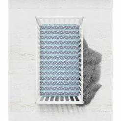 - This Bacati 3-piece Crib Set Includes Reversible 4 layered muslin lux blanket/Playmat (33 x 43 inches), Muslin Crib fitted sheet (52 x 28 x 6 inches) and Cotton Percale Crib Skirt/Dust ruffle (13 inch drop) in fun, colorful and signature prints in 100 percent cotton muslin fabrics. Designed in United States by Experienced Designers. Many coordinating items available to purchase separately in this Bacati Boys Triangles Aqua Navy Bedding Collection.