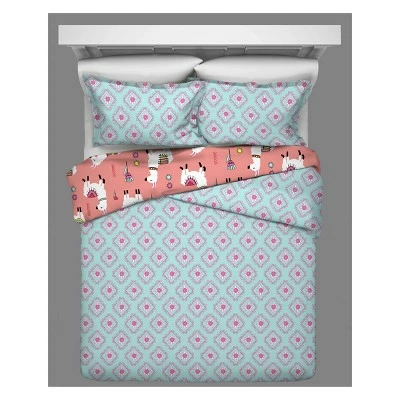 High fashion design meets imaginative and spontaneous style with the Vue Llama Drama Reversible Quilt Set. This trendy quilt features playful motifs of llamas in bright colors paired with global motifs. Reverse features allover diamond and floral print. Twin XL quilt set includes one 68×90 reversible quilt and one 20×26 standard sham. Full/Queen quilt set includes one 90×90 reversible quilt and two 20×26 standard shams. King quilt set includes one 102×90 reversible quilt and two 20×36 king shams. Shams are random cut, but match in pairs. Set is 100% cotton. Machine washable.