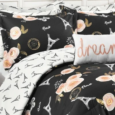 The reverse side of this Vintage Paris Rose Butterfly Script Comforter Set features the Eiffel Towers and the word Paris engineer printed against a white background. This gives you two great looks in one set. When you’re ready for a change, simply turn the comforter and shams over to the other side and you have a whole new look. This side with its more subtle print is ideal for layering. Because it’s reversible, the look of this Vintage Paris Rose Butterfly Script Comforter Set is so versatile that you can use it in a child’s bedroom, young adult’s bedroom, guest bedroom, master bedroom or even a college dorm room. Anyone who dreams of visiting Paris or enjoys romantic French culture will surely adore this set. The Vintage Paris Rose Butterfly Script Quilt Set is available in three sizes. The Twin-XL size is a 5-piece set which includes the comforter, one matching pillow sham, one pillowcase, and two decorative throw pillows. The Full/Queen and King sizes are 7-piece sets which include the comforter, two matching pillow shams, two pillowcases, and two decorative pillows. This set gives you a complete look for your bed right out of the package. The rectangular decorative pillow features the word Dream embroidered on the front with unique trim detail. The circular decorative pillow is an off-white faux fur pillow for added texture and coziness. For your convenience, the comforter, shams and pillowcases in this Vintage Paris Rose Butterfly Script Quilt Set are safe to machine wash and tumble dry. However, the decorative pillows should be spot cleaned only. Part of the Vintage Paris Rose Collection.