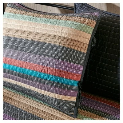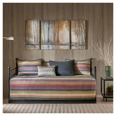 For an updated look, the Reyes 6pc Reversible Daybed Cover Set can bring a brand new esthetic to your guest room. The quilted collection features shades of purple, teal, and earth tones in thin striping to create a beautiful look. The three shams that come with this set have corresponding striping to match the quilt perfectly.