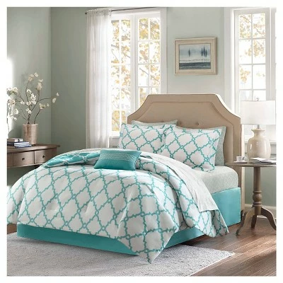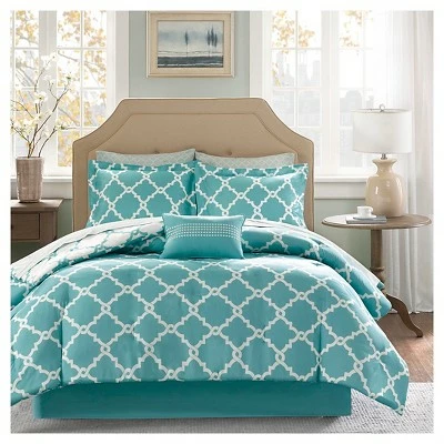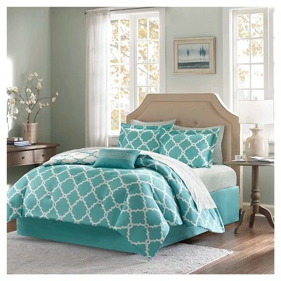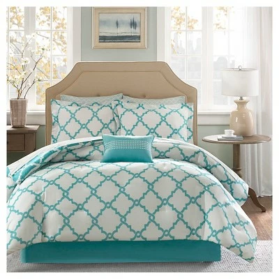 The Becker Complete Bed and Sheet Set creates a simple yet chic look in your space. The fretwork design creates a modern look with its either soft or bold color design. This set is completely reversible allowing you to change the feel of your room instantly. A 100% cotton printed sheet set included in the bedding set also features a smaller scale fretwork pattern for a finished look. Machine washable for easy care, this reversible complete bedding set offers a total transformation and modern update to your bedroom.
