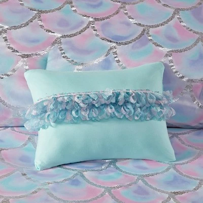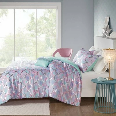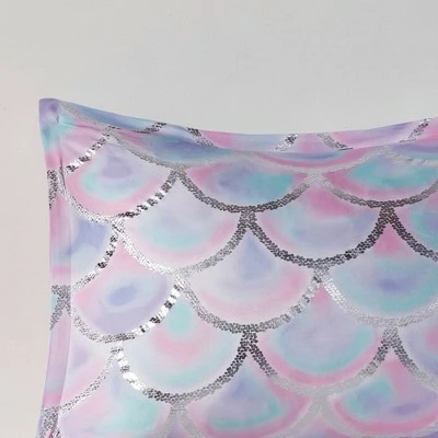 Brighten your bedroom decor with the Mi Zone Daphne Metallic-Printed Reversible Comforter Set. This decorative bedding set includes a reversible comforter adorned with a silver metallic fish scale print on the pastel purple, aqua and pink background on the front and a solid aqua color with pintuck detailing on the reverse, and also comes with a matching sham(s) and an oblong pillow with frill detailing, filling your sleeping nook with exciting colors and patterns. Made with a microfiber construction with generous filling, these pieces provide you complete comfort as you take a catnap or hit the snooze button. Bring in contrasting sheets and comfy pillows to put together a stunning bedding ensemble.