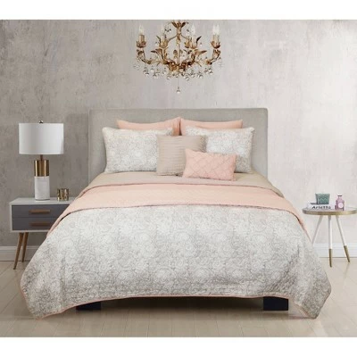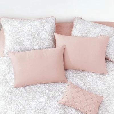 Update and refresh your restful retreat with the delicate floral swirl design on the Katie Blush Layered Comforter and Coverlet Set from Riverbrook Home. This multi piece set is perfect for cozying up. Includes comforter, coverlet, two decorative throw pillows and coordinating pillow shams. Machine washable for easy care and maintenance.