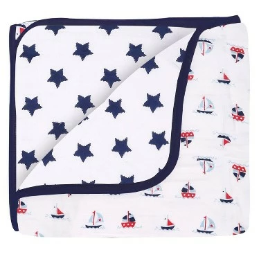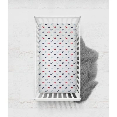 - This Bacati 3-piece Crib Set Includes Reversible 4 layered muslin lux blanket/Playmat (33 x 43 inches), Muslin Crib fitted sheet (52 x 28 x 6 inches) and Cotton Percale Crib Skirt/Dust ruffle (13 inch drop) in fun, colorful and signature prints in 100 percent cotton muslin fabrics. Designed in United States by Experienced Designers. Many coordinating items available to purchase separately in this Bacati Boys Nautical Whales Boat Red Blue Navy Bedding Collection.