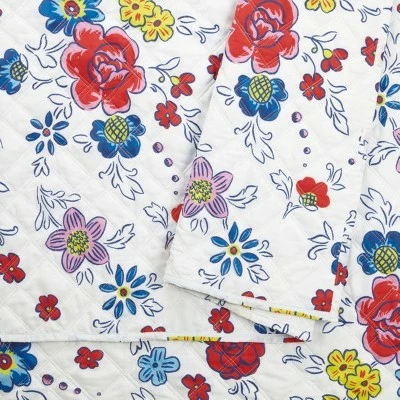 Transform any space into a tranquil contemporary setting with this whimsical look and feel of Flower Patch quilt set from Molly Hatch by Maker’s Collective. Cheerful floral motifs in shades of red, pink, blue and yellow will brighten and inspire your day. Completely reversible, this quilt is made of 100% polyester. Double diamond stitch quilting secures the quilt and sham. Extra value binding runs all four sides of the quilt and sham for long lasting quality.