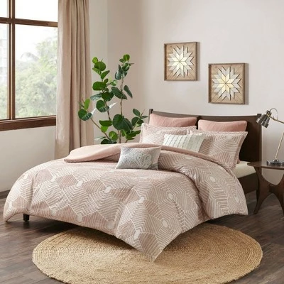 Add a rich textural look to your bedroom with the Ellipse Cotton Jacquard Duvet Cover Set. The cotton duvet cover features a geometric design in a clipped jacquard with a solid reverse that complements the top of the bed, for a shabby chic look. Two matching shams repeat the reversible design seen on the duvet cover to complete the farmhouse-inspired aesthetic. This comforter is OEKO-TEX certified, meaning it does not contain any harmful substances or chemicals to ensure quality comfort and wellness. Machine washable for easy care, this clipped jacquard duvet cover introduces texture and dimension to give your bedroom a one-of-a-kind update. Button closures allow you to place a comforter insert within the duvet cover and inside corner ties help prevent it from shifting. Insert is NOT included.